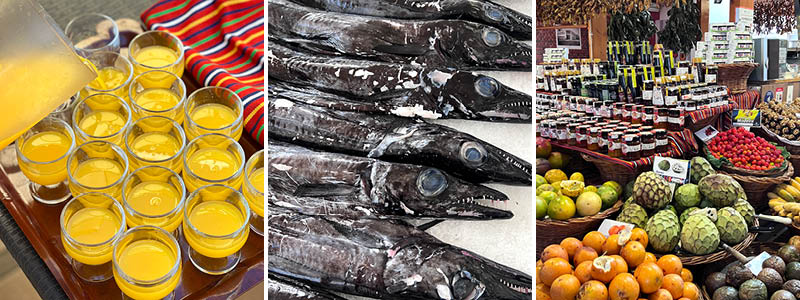 Efter et besøg i den overdådige kirke går vi mod Rådhuspladsen og videre langs den velkendte Santa Maria-gade med de kulørte døre. Efter den store oversvømmelse i februar 2010, hvor mange huse blev ødelagt, besluttede man, at man ved genopbygningen skulle lade indbyggerne male sine døre med valgfrie motiver. Turen slutter ved den kendte markedshal, hvor vi kan betragte farvestrålende frugter i både frisk og tørret form og den store fiskehal, hvor de frygtelig grimme espada-fisk ligger på rad og række med deres skarpe tænder. Vi går herefter videre til terrassen og slår os ned i den strålende sol. Her får vi en demonstration i, hvordan Madeiras nationaldrink – den læskende og smagsfyldte poncha – tilberedes. Vores dygtige bartender blander sukker, rom og frisk frugtjuice og hælder op i glassene. Saúde ao Funchal – skål for Funchal!
