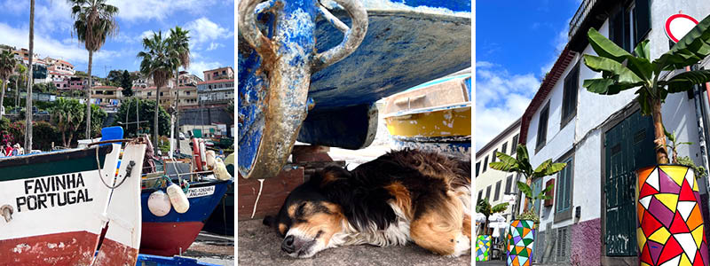 Da alle har fået købt det, de vil have med sig hjem til Skandinavien, kører bussen mod vores næste stop. Nu er det den lille fiskerby Câmara de Lobos, der hilser os velkomne. Sædvanligvis kan man gå langs stranden fra vores hotel de ca. tre kilometer til fiskerbyen, men på grund af den sidste tids meget hårde vejr er gangstien afspærret. Vel ankommet får vi tid til at opleve byen på egen hånd, og Oscar og jeg tager forbi det højeste punkt, i hvert fald hvad vi kan se. Her kan vi se ud over både vand og land, og på vejen tilbage til bussen går vi forbi de farverige fiskerbåde i havnen. Her går hverdagslivet sin vante gang, og på mange måder føles Câmara de Lobos som noget af det mest autentiske, vi oplever på vores rejse. Fiskerne kommer ind med dagens friskfangede fisk, de tager fat på det nødvendige vedligehold af bådene, og under en anden båd ligger en hund og sover fredfyldt.
