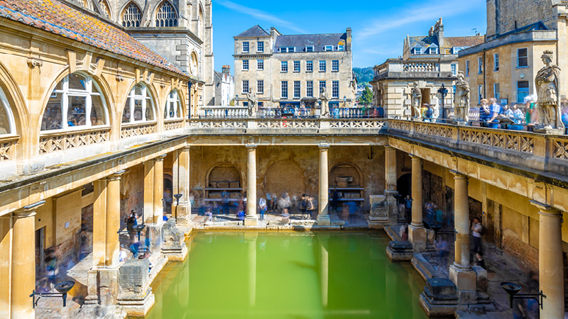 Et af Baths mest berømte trækplastre er de romerske bade, som er blandt de bedst bevarede i verden. Badene er mere end 2000 år gamle og er en imponerende opvisning af mosaikker, skulpturer, bassiner og søjler, der alt sammen giver et fascinerende indblik i den klassiske romerske badekultur. En stadig aktiv varm kilde i kælderen sender fortsat det mineralholdige vand op til overfladen og opretholder Baths rige historie som kursted.