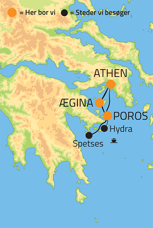 Vi er idag nået til vejs ende på vores skønne græske ø-hop og dog, Vi har stadig tid til at nyde Ægina by, drikke en sidste frappé og gøre vores sidste indkøb inden vi skal have fornøjelsen af en sidste sejltur tilbage til Piræus. Herfra omstiger vi til bus og begiver os til lufthavnen. Der er intet bedre end den oplevelse det er at sejle mellem de græske øer, fandt du din favorit iblandt dem?