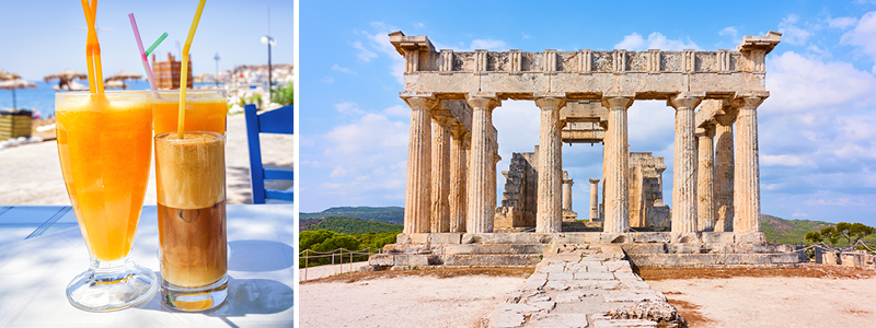 Billede: Friskpresset juice og frappé-kaffe og Aphaia-templet på Ægina.