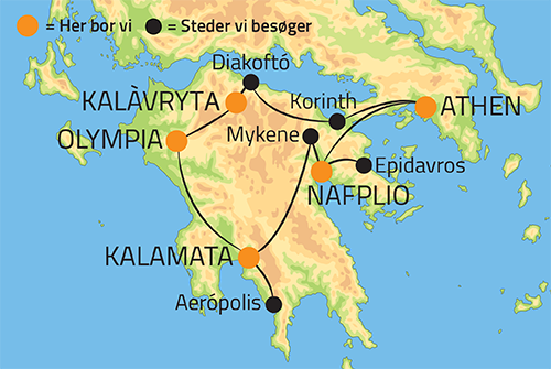 Efter en god frokost og en vinsmagning i Nemea, går rejsen videre gennem Peloponnes’ hjerte, hvor man blot skal læne sig tilbage i sædet, slappe af og nyde naturscenerierne. Sidst på eftermiddagen er vi fremme ved næste opholdssted. Vores hotel ligger ud til vandet i rolige smukke omgivelse ca. 6 kilometer fra Kalamata by og dens livlige havnepromenade. Et perfekt sted at nyde roen og slappe af og evt. bade lidt i havet eller poolen ovenpå dagens rejse og de mange dejlige indtryk. Vil man ind og nyde aftenen i byen anbefales det at snuppe en taxi hvilket ikke er dyrt i Grækenland. Måske foretrækker du at slappe af på din egen balkon med udsigt til havet samt blive at spise på hotellet.