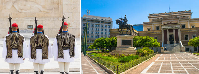 Billede: Det græske parlament på Syntagma-pladsen med de festklædte vagter.