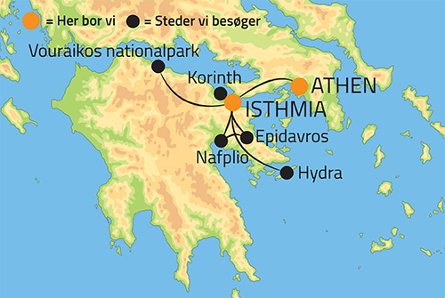 Idag forlader vi Athen og sætter vi kurs mod Peloponnes - Grækenlands største halvø. Vores hotel ligger ved vandet ikke langt fra udmundingen af den imponerende og menneskeskabte kanal, som skiller Peloponnes fra det øvre fastland. Allerede tilbage i oldtiden var der tanke på at skabe en gennemgang over den seks km brede landtange. Kejser Nero satte i år 67 e.Kr. 6.000 jødiske krigsfanger til at påbegynde udgravningen, men hans værk blev ikke færdigt. Herefter gjorde venetianerne forgæves forsøget. Omsider i 1893 åbnede Grækenland den endelige forbindelse, som afkortede sejladsen mellem det Ioniske Hav og Piræus (havnen ved Athen) med 200 sømil. Vi stopper naturligvis for at se nærmere på kanalen, evt. toiletbesøg samt for evt. indkøb af vand og snacks til den kommende dag. Hotellet i Isthmia, hvor vi skal være i fem nætter, ligger i rolige omgivelse ned til vandet. Det er et skønt udgangspunkt for dagene iført vandrestøvler og indbyder til afslapning og ro når vi vender tilbage om eftermiddagen. Vi har halvpension på hotellet (morgen -og aftensbuffet) OBS; ved meget sen ankomst til Istmien vil der stå en kold anretning på værelset.