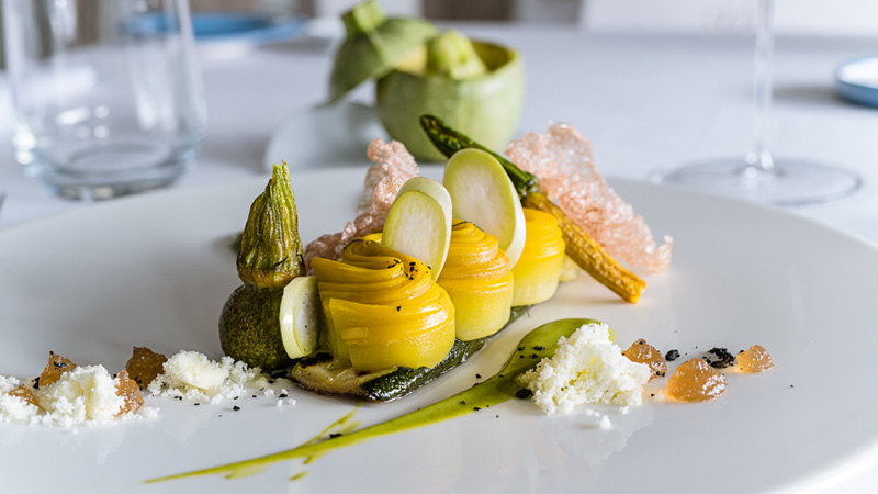 Hotellet er bygget ind i klipperne, og fra kystvejen træder man direkte ind i den store reception. Der er fælles opholdsrum, Bistro og bar på 5. sal, mens restauranten ligger på 8. sal - og i sommersæsonen kan morgenmaden indtages på den store panoramaterrasse.
