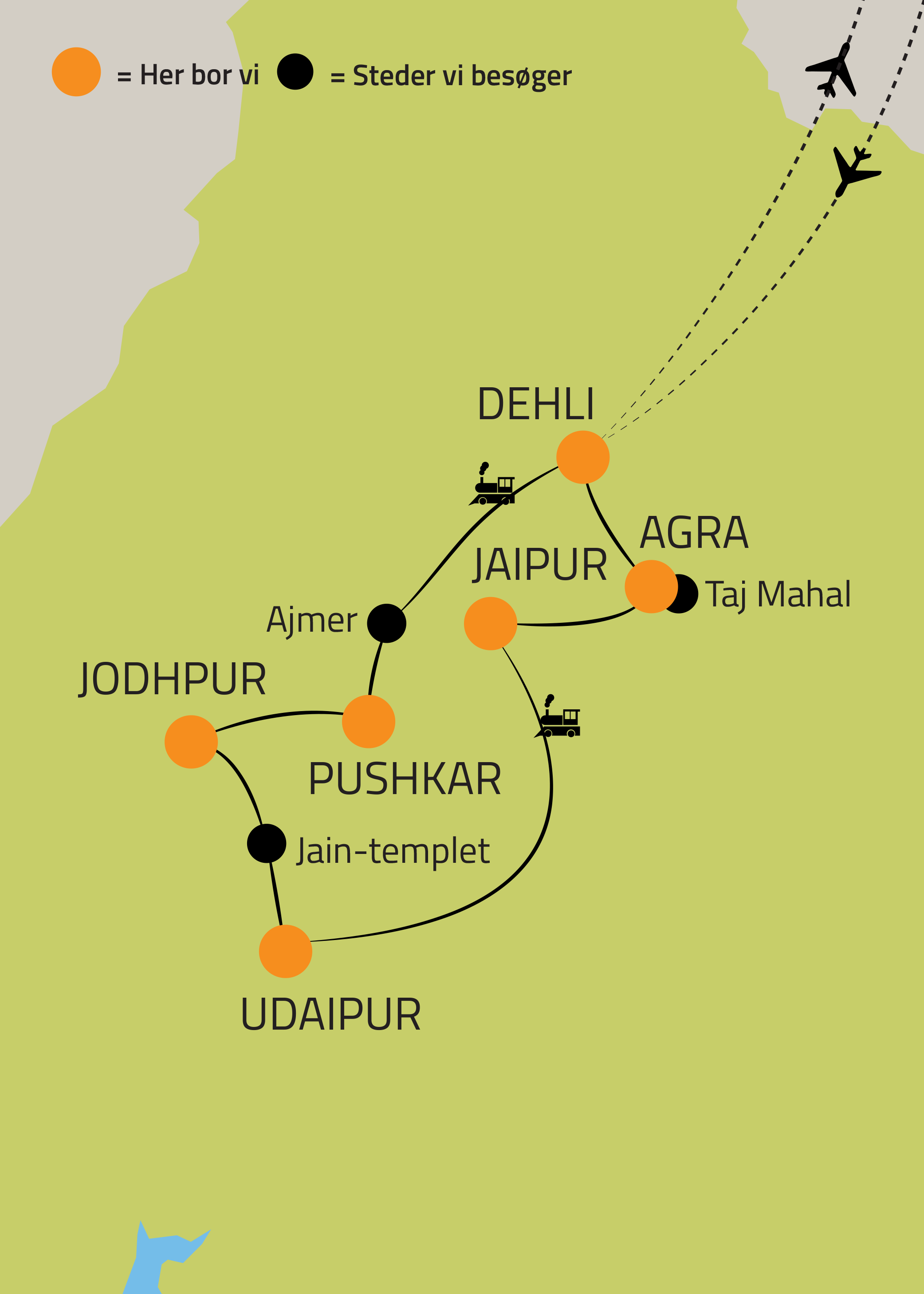 Vi står tidligt op og kører til togstationen. Her tager vi Shatabdi Express toget fra New Delhi mod Ajmer. Toget afgår tidligt, og mens vi kører mod vores næste eventyr, kan vi nyde udsigten til det spraglede og smukke, indiske landskab, der glider forbi.