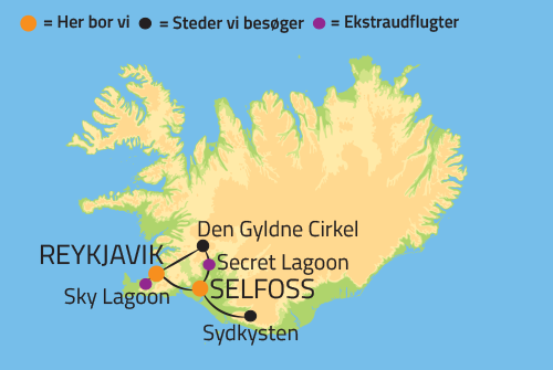 Spruttende gejsere og brusende vandfald er blot nogle af de højdepunkter, som du har i vente sammen med vores dygtige danske rejseleder, på denne rejse til eventyrlige Island. Med base Selfoss og i Reykjavik, skal vi sammen opleve den verdenskendte Gyldne Cirkel, hvor vi skal se Þingvellir (Thingvellir) National Park, Gullfoss og Strokkur. Vi skal også køre ved Islands sydkyst, hvor de smukke vandfald: Seljalandsfoss og Skógafoss venter vores besøg, og herudover kan vi se frem til en guidet gåtur i Reykjavik. Undervejs dykker vi ned i den islandske historie, og får fortællinger om fortid, nutid og fremtid.