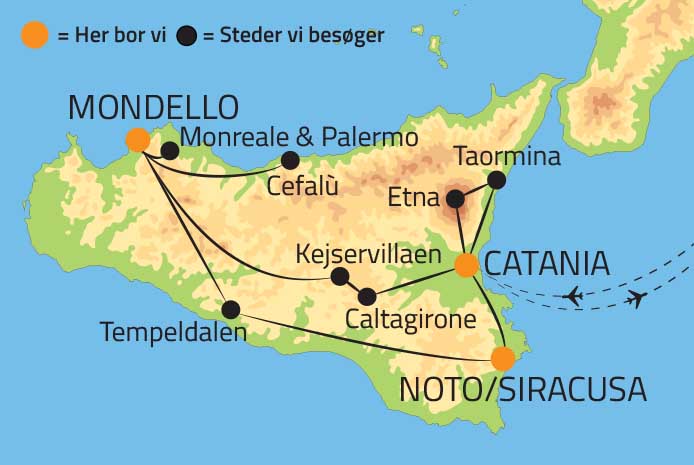 Vi lander ved Siciliens hovedstad Palermo hvorefter vi har en kortkørsel ud til den mondæne badeby Mondello hvor vi skal bo på rundrejsens første del. Afhængig af ankomsttidspunkt kan der forekomme ventetid på at få værelserne.