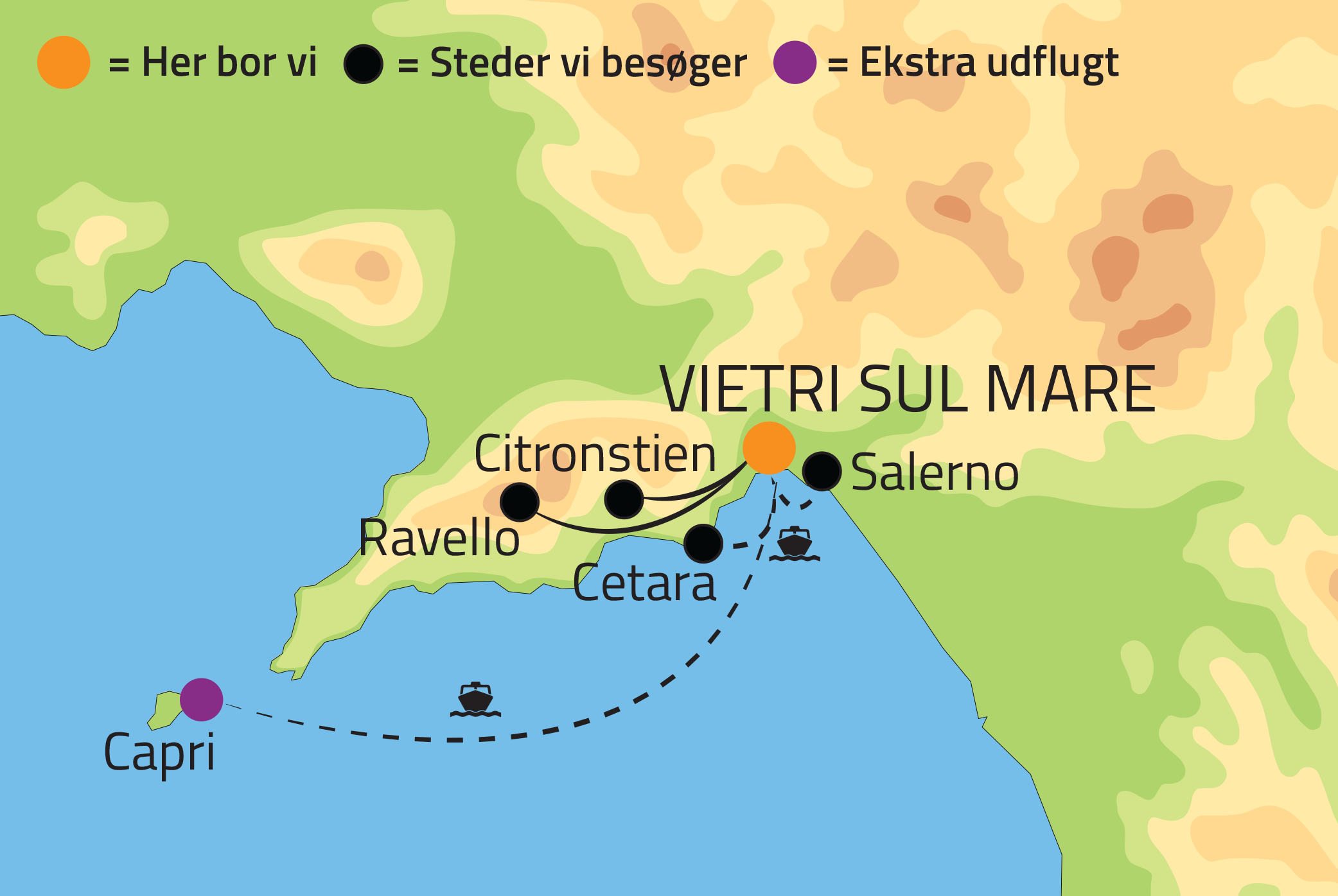 Dagen starter med en guidet tur i Vietri sul Mare, hvor du vil få mulighed for at opdage byens rige historie og kultur. Du vil lære om Vietris berømte keramikhåndværk, der pryder mange af byens bygninger. Efter turen besøger vi en limoncello-producent. Vi smager på den gule søde likør, som er en utrolig populær måde at anvende kystens citroner på. Det er normalt for de lokale at afslutte en god middag med et iskoldt glas limoncello, der siges at fremme fordøjelsen. Likøren har også vundet popularitet verden over og indgår blandt andet i den berømte og sommerlige cocktail kaldet Limoncello Spritz