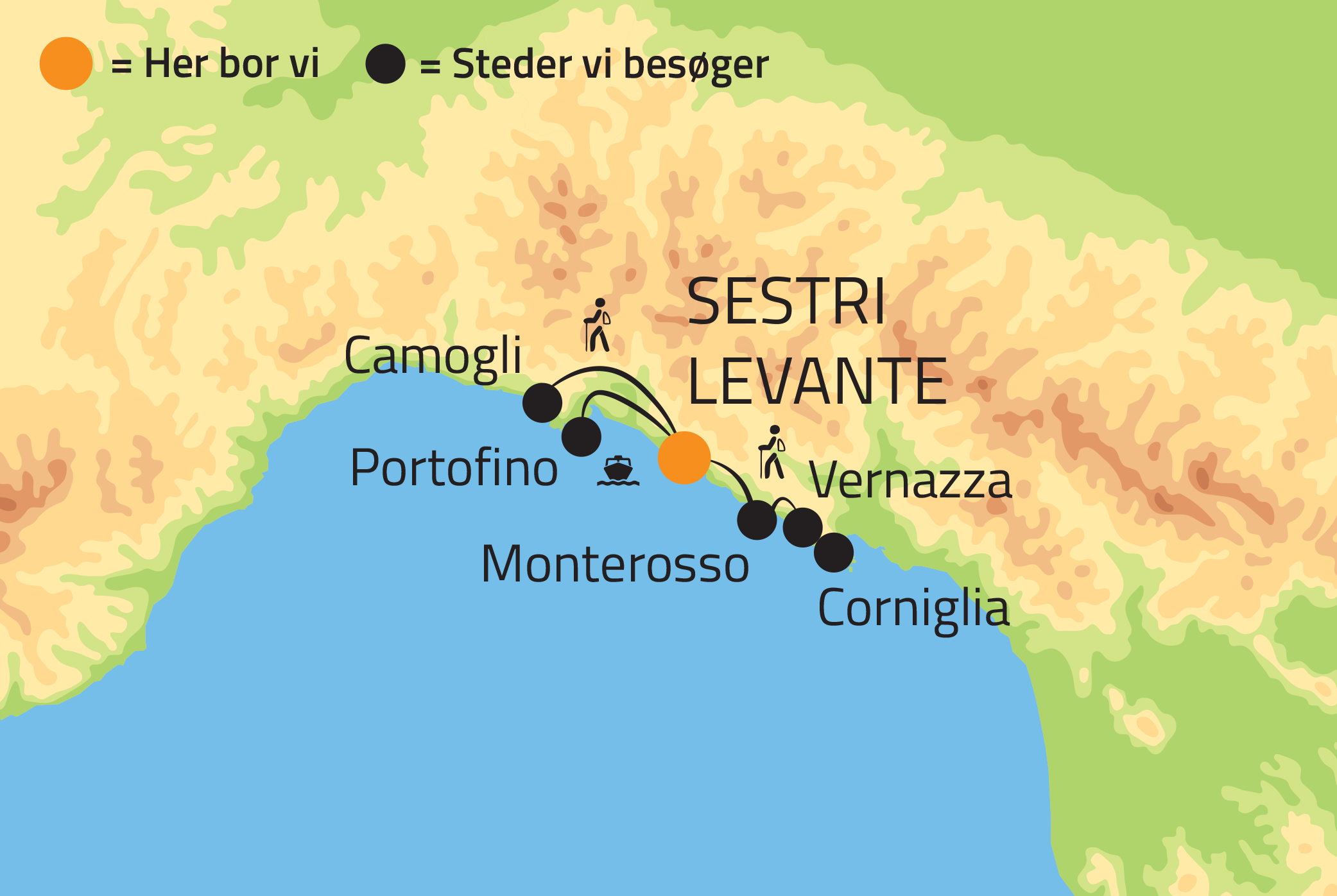 Faktum er, at vandreruterne er den mest naturlige – og mest historiske – måde at komme fra by til by. Vores dansktalende rejseleder har styr på det hele og tager os med på fire fantastiske vandreeventyr, skræddersyet til os. Vi vandrer ad smukke kyststier blandt oliventræer, vinranker, vild basilikum, stejle klipper og farverige huse, som klamrer sig til bjergvæggene. Undervejs nyder vi italiensk mad og vin efter anbefaling fra vores rejseleder. En af dagene besøger vi desuden populære Portofino – ’den smukke havn’, som den hedder på italiensk.