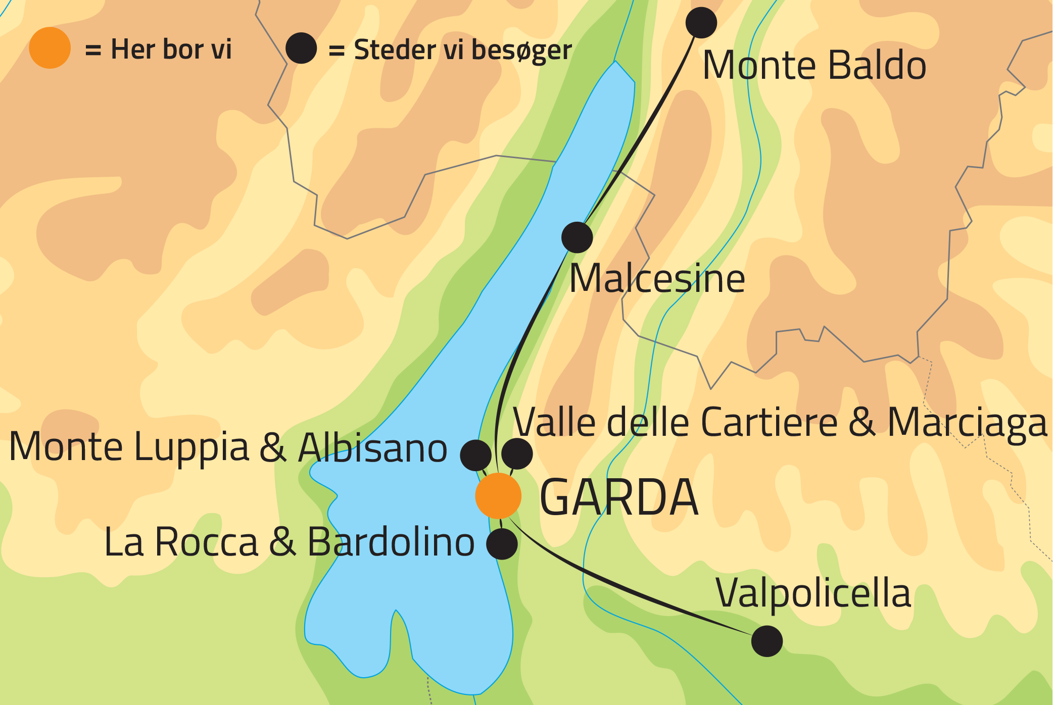 Gardasøen har i mange år været en sikker favorit blandt rejsemål i Italien. Og det kan vi godt forstå. Med sin perfekte beliggenhed i det nordlige Italien, lige ved foden af Alperne mellem Venedig og Milano, er søen både hyggelig og nem at komme til – og så ligger den ikke alt for langt væk. Gardasøen har et mildt middelhavsklima, og mens den sydlige del er frodig med store mængder frugtplantager, oliventræer og vinranker, er den nordlige del mere dramatisk, barsk og bjergrig. På mange måder ligner Gardasøen de smukke norske fjorde – med den forskel, at de smukke omgivelser suppleres med farverige, velduftende blomster og træer, som flankerer vejene mellem de gamle, romantiske middelhavsbyer. Gardasøen og de omkringliggende byers årtusinder gamle historie byder desuden på gastronomiske oplevelser i en klasse ud over det sædvanlige. Alle dette – og meget mere – opleves allerbedst til fods. De mange vandrestier i området er kendte af både nybegyndere og mere erfarne vandrere, og vi glæder os til at begive os ud på nogle af regionens smukkeste strækninger. Det er på høje tid at snøre vandrestøvlerne og fylde vandflasken. Benvenuti al Lago di Garda!