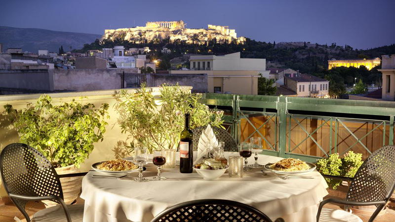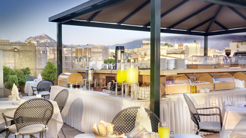 Du finder desuden en hyggelig restaurant (sæsonåben), som er beliggende på hotellets tag med udsigt over Akropolis.