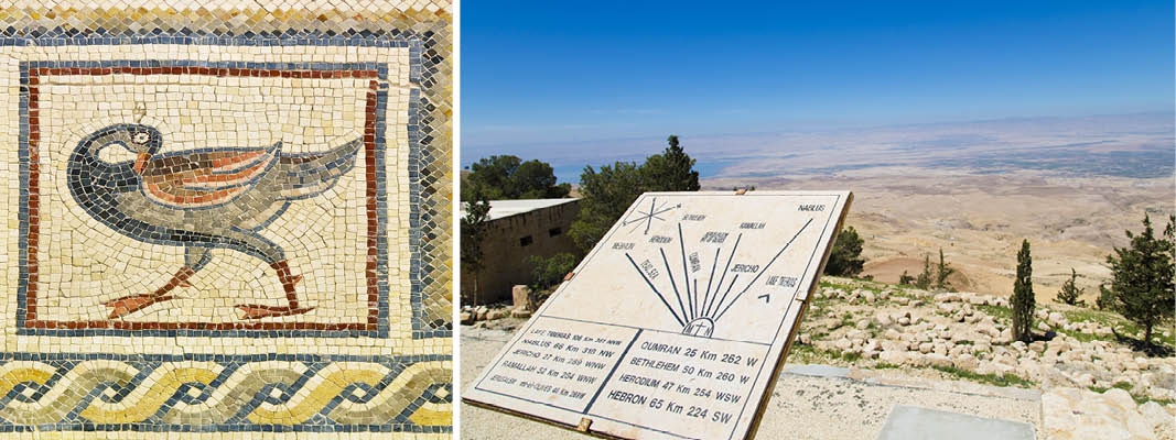 Billede: Udsigt fra Nebo-Bjerget og fine gulvmosaikker i kirken i Madaba. Jordan.