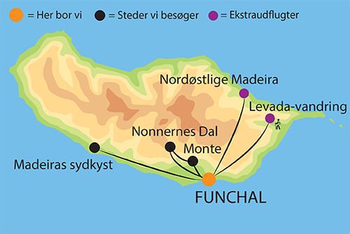 Dagsprogrammet er vejledende, og udflugterne afvikles måske i en anden rækkefølge grundet lokale forhold. Den endelige rækkefølge oplyses ved ankomsten til Madeira. Forbehold for ændringer.