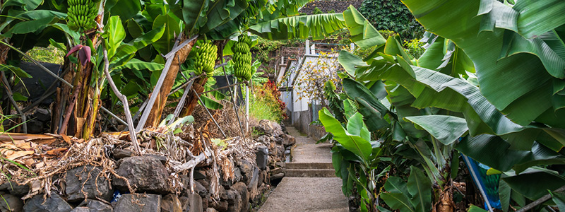 Næste stop på turen er i en banan-plantage i området ved Madalena Do Mar. Vi går en tur gennem det grønne landskab, hvor vi får meget mere at vide om produktionen af en af en af Madeiras vigtigste afgrøder, bananen. Den vokser på en trælignende palme, men er faktisk en urt med en han- og en hunblomst. Madeira-bananerne er sødere i smagen og en smule mindre end, hvad vi er vant til.