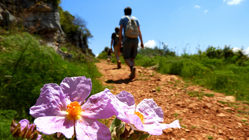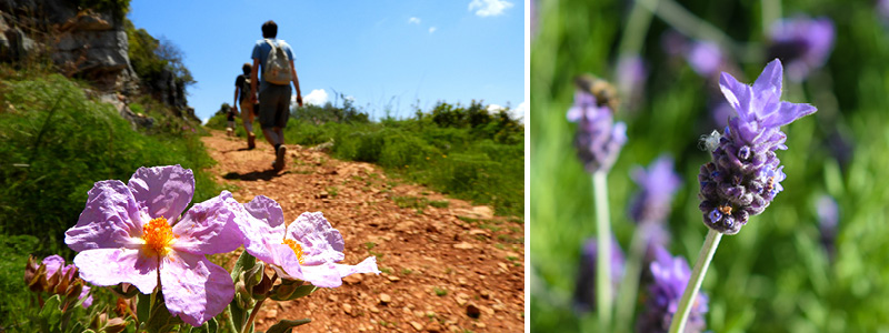 Klippefremspringet er dækket af en blanding af johannesbrødtræer, vilde oliventræer og steneg, der skaber en frodig og mangfoldig skov. Vi møder også enebærbuske og krat af kermes-eg krat på vores vej – blandet med aromatiske blomster som lavendel, rosmarin, fennikel og timian, der giver omgivelserne et kulørt strejf samt en dejlig duft.