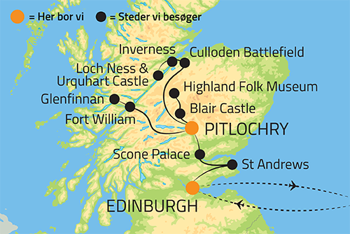 På denne spændende rundrejse stifter vi både bekendtskab med Skotlands højland og lavland. Højlandet er berømt for sine storslåede bjerge, dybe lochs og dramatiske landskaber – en stor kontrast til det blidere, mere bølgende lavland med sine historiske byer og frugtbare marker.