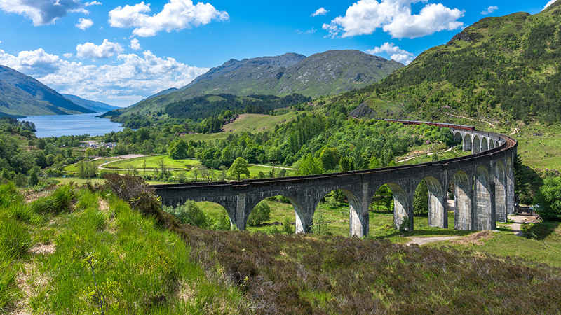 Efter vores besøg i Fort William tager vi på togtur gennem højlandet. Vi stiger ombord på ScotRails tog, som smyger sig igennem nogle af de smukkeste skotske landskaber fra Fort William til Glenfinnan. Her skal vi se den berømte Glenfinnan-viadukt, en imponerende jernbaneviadukt bygget mellem 1897 og 1901 af Robert ’Concrete Bob’ McAlpine. Viadukten har i alt 21 store buer, der hver spænder over 15 meter. Det er nemt at forstå, hvorfor viadukten er blevet en ikonisk attraktion – her er tale om stor ingeniørkunst, og fra udsigtspunktet kan du beundre synet af den storslåede viadukt omgivet af højlandet dramatiske landskaber. Er der noget bekendt ved synet, kan det måske skyldes, at du har set Harry Potter-filmene eller The Crown, hvor viadukten er med. Bemærk, vi kører med ordinært tog og ikke damptog på strækningen.