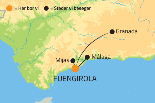 Vi bor, afhængig af afrejsedato i Torremolinos eller Fuengirola, på komfortable hoteller tæt på hav og strand. Her bliver vi bekendt med områdets største seværdigheder på en orienterende byvandring. Glæd dig til en heldagsudflugt til Granada, hvor vi udforsker den gamle og historiske bydel. Vi besøger også den maleriske hvide landsby Mijas, samt Malaga, hvor kultur og moderne byliv går hånd i hånd.