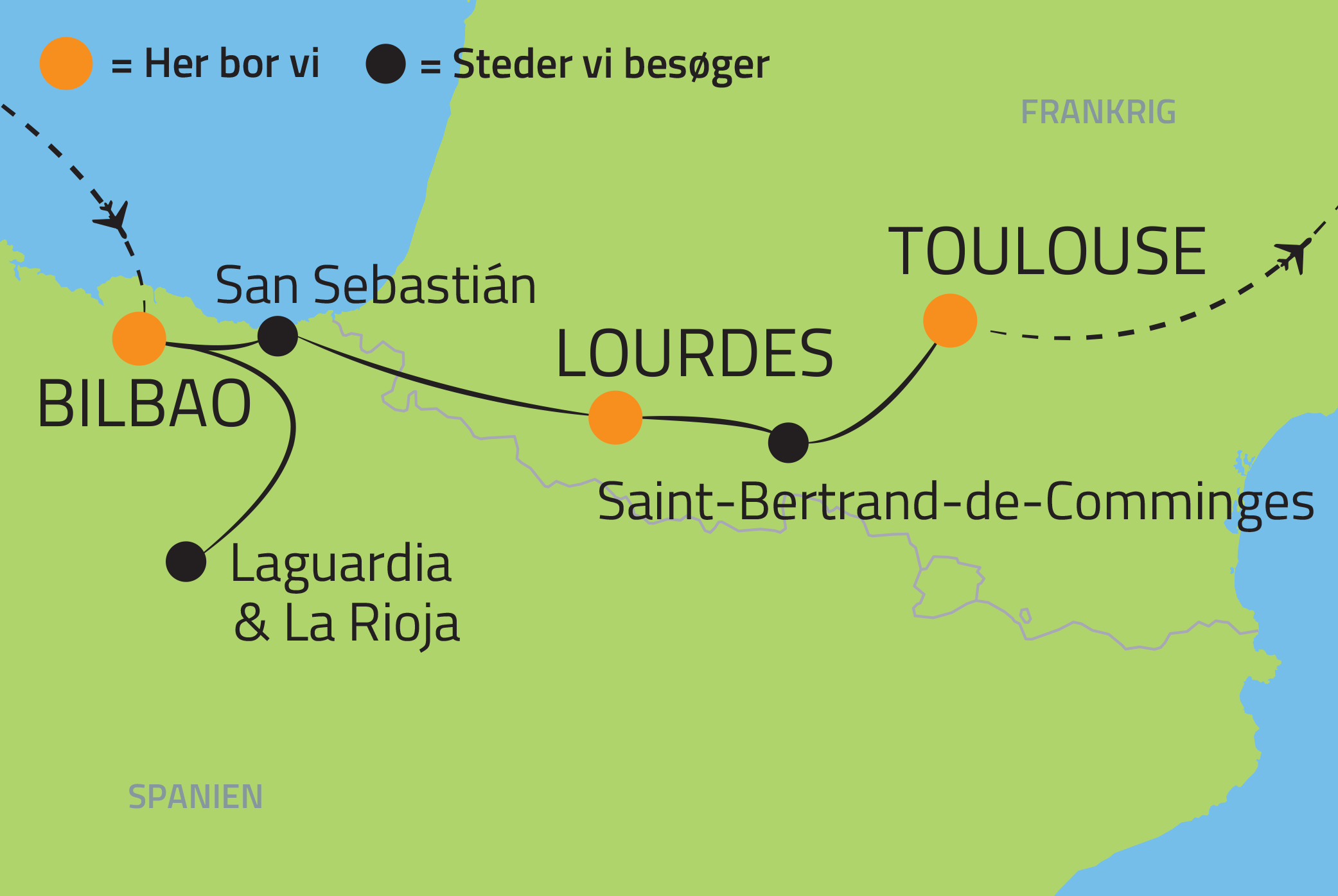 Vi ankommer først på eftermiddagen til lufthavnen i Bilbao. Herfra kører vi en panoramisk transfer til vores hotel i det centrale Bilbao. Vi gør et kort stop på turen ved udsigtspunktet Artxanda. Herfra har vi et smukt vue fra oven ud over Bilbao, floden og byens monumenter omkranset af det smukke, grønne bjergområde, byen er omgivet af.