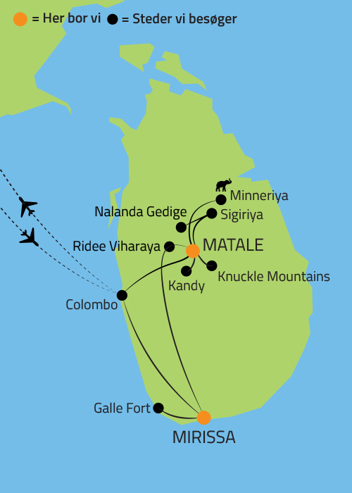Herefter fortsætter vi til Mirissa, hvor vi tjekker ind på det dejlige Mandara Resort med en fantastisk havudsigt. Her kan vi de næste dage slappe af ved stranden og nyde resortets faciliteter og den friske havluft. Mirissa er kendt for sin afslappende atmosfære, og man kan vælge at udforske de lokale butikker og caféer eller ’nøjes med’ at nyde solen og havets brusen fra en liggestol.